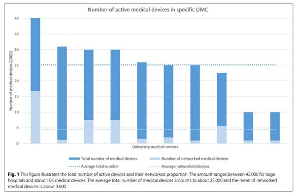 Internet of Medical Things Medical Devices, Source: Fig 1 Image source and data from Willing et al., “Analyzing Medical Device Connectivity and Its Effect on Cyber Security in German Hospitals.” Open Access: The article is licensed under a Creative Commons Attribution 4.0 International License. http://creativecommons.org/licenses/by/4.0/ <ref name="willing"/>