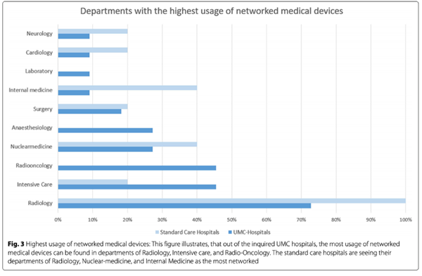 Internet of Medical Things Medical Devices, Source: Fig 3 Image source and data from Willing et al., “Analyzing Medical Device Connectivity and Its Effect on Cyber Security in German Hospitals.” Open Access: The article is licensed under a Creative Commons Attribution 4.0 International License. http://creativecommons.org/licenses/by/4.0/ <ref name="willing"/>