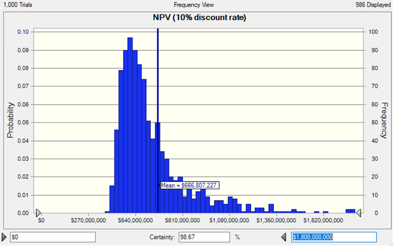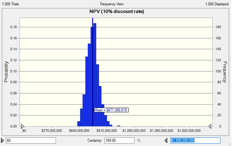 For both scenarios, the NPV for these R&D programs gives an estimated mean for the NPV of approximately $670M. With the log-linear model for incidents, the mode is decreased to $530M while the long tail is increased to $1.B over the range of 1000-run samples. This model is focused on the resulting revenue for the product and reduced operations cost. A benefit to Penultimate Frontier’s clients would be the resulting improvement in security operations. A future study could be to examine the value from the client’s perspective.