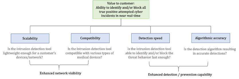 The overall value to a customer to properly secure networked medical devices, or an Internet of Medical Things (IoMT) device, against attacks is to be able to identify and prevent a cyber attack from exploiting the device. While there are several mechanisms to do this (e.g., encryption, vulnerability management, different segregation for network deployments), the value of a distinct intrusion detection and/or prevention solution, at its core, can be summarized here as the ability to detect a true positive cyber attack in near real-time. False positives, while a nuisance to the customer due to potential business disruption, are far less of a risk than a false negative – i.e., behavior on the network or device that is misidentified as benign. Therefore, while ease of use is a factor for why a customer would value a product, it is a secondary consideration.