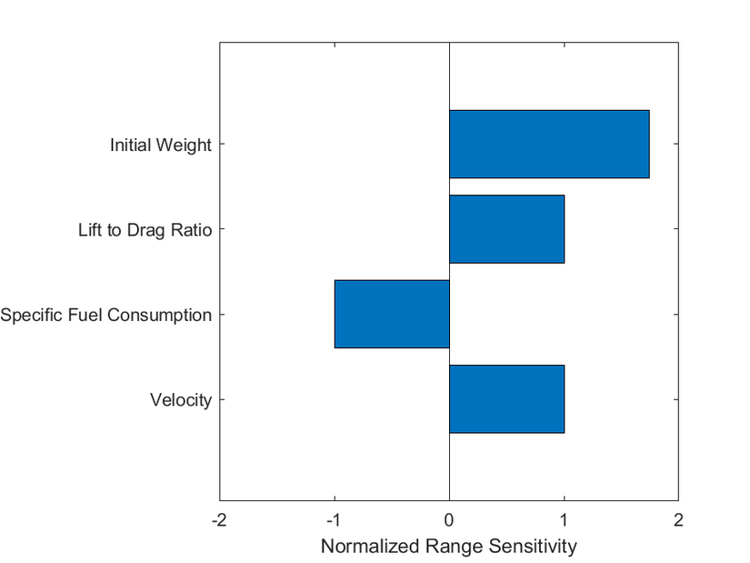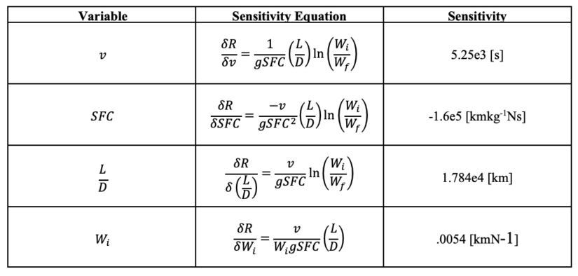 Using baseline values for the variables of the Breguet range equation, we can calculate numerical values for the sensitivity of range to a subset of variables. Note, this simplification of the range equation does not include the variation in v, SFC and L/D during the climb and descent phases.