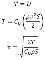 For this FOM, we develop a technical model based on the assumption that during cruise the aircraft is in steady flight, meaning that thrust T exactly equals the drag D. We then express drag in terms of the drag coefficient and solve for velocity as follows: