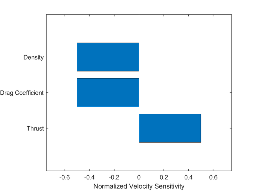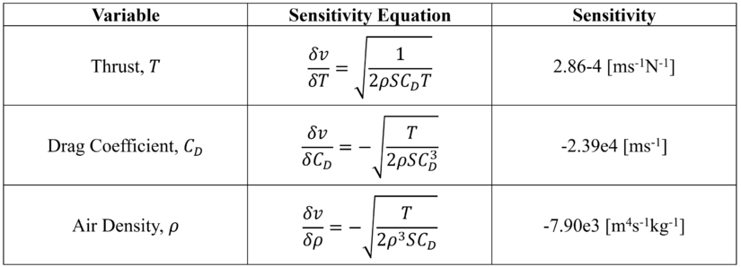 As such, we have expressed the velocity as a function of thrust, drag coefficient, flow density, and reference area. Ignoring the reference area, the velocity sensitivity to vehicle thrust, drag coefficient, and air density is expressed by taking the derivative with respect to each variable. The below table provides the resultant sensitivity equations along with the dimensional sensitivity result.