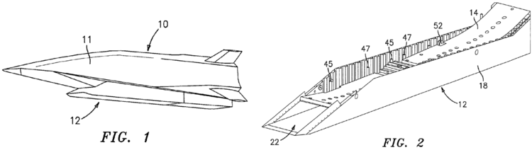 3. Patent number US 20150108269A1 on hypersonic aircraft covers the invention of a Mach 4.0 and up airliner for carrying passengers over long distances. The aircraft has a unique low-profile design intended to maximize aerodynamic performance. The patent covers the location and integration of two engines positioned above the wings that help to stabilize the structure and reduce wave drag. The engines are attached to the vehicle by a composite titanium structure that passes through the wing box. Several other geometry considerations that dictate the vehicle’s aerodynamic performance are also noted in the patent. Such work is a clear step towards future hypersonic commercial transit. Diagrams showing the patented technology are shown in Fig. 4, below. It is noted that the vehicles which will eventually transport people and cargo across oceans at hypersonic speeds will likely look very different than this one. However, such vehicles will likely include aerodynamic designs that are similar to, or match those discussed in the mentioned patent.