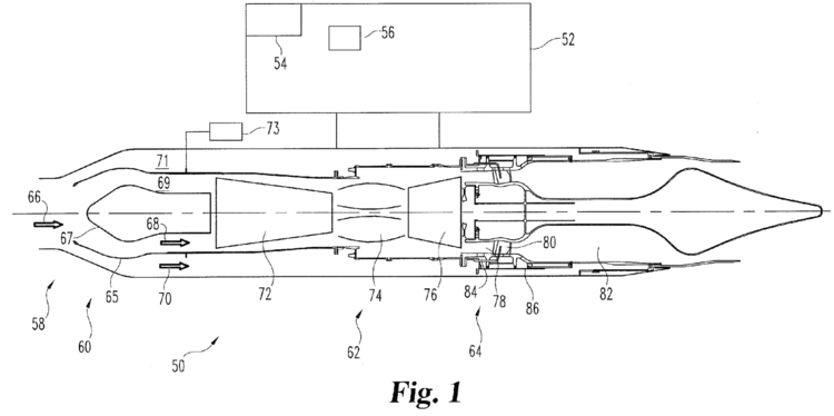 2. Patent number US 20120159925 A1 on a turbine based combined cycle engine discusses the invention of a high-speed aircraft engine that can operate in multiple modes and at a range of Mach numbers, including in a supersonic ramjet mode or in a subsonic turbine mode. The invention includes a bypass valve that can limit airflow into the gas turbine engine when operating at high speeds. In this mode, some compression is generated by shock waves located in the engine inlet, with no need for the air to pass through a rotating compressor. In addition, the patent claims the cylindrical structure used to house the engine, as well as the method used to capture and combust airflow within the engine. A diagram of the invention pulled from the patent document is shown in Fig. 3, below. Such an invention can be considered foundational work for the development of combined-cycle subsonic, supersonic, and hypersonic engines that will eventually power commercial hypersonic transport vehicles.