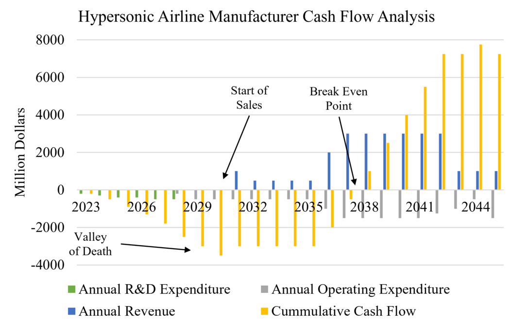 Current hypersonic airline manufacturers must invest in the previously mentioned research and development projects so that they can begin constructing (and selling) hypersonic aircraft. As such, manufacturers will initially accept a negative cash flow such that they may achieve a net positive income in the long term. The below figure provides a projection of what we may expect to see from a hypersonic transport vehicle manufacturing company's finances over the next two decades.