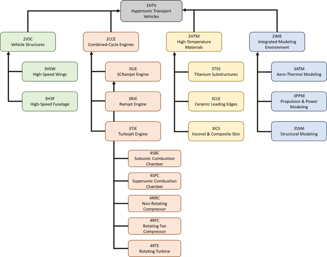 A hierarchical breakdown of a subset of the technologies required to enable the development of hypersonic transport vehicles is shown below. Note that the level 1 hypersonic transport vehicle technology is decomposed into four level two sub-technologies: vehicle structures, combined-cycle engines, high-temperature materials, and integrated modeling environments.