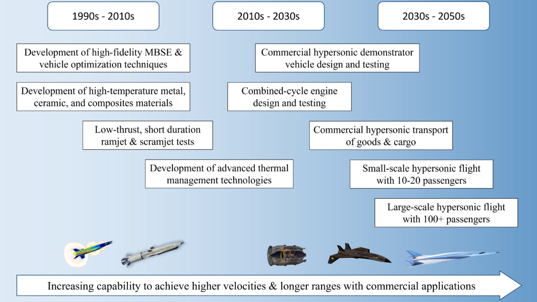 Our target is to develop a commercial aircraft capable of transporting people and cargo at hypersonic speeds. Before this can be achieved, advances in underlying technologies such as improved high-temperature materials, thermal management systems, integrated design methodologies, and combined-cycle engines must occur. A subset of the various milestones that are occurring today, and will occur in the future en route to practical commercial hypersonic travel is presented in the high-level "swoosh" chart below. This chart is further broken down into the more detailed timeline shown below, with example images of the various technologies under development shown near the bottom.