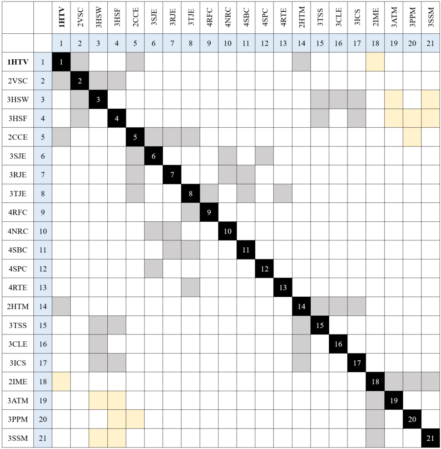 It is noted that several interactions exist between the various sub-technologies shown below. Such interactions are indicated in the design structure matrix (DSM), shown below. Interactions shown in grey represent either physical or component-type linkages (i.e. high-speed wings are part of hypersonic transport vehicles), whereas interactions in yellow represent information flows (i.e. aero-thermal analysis models are required for the development of high-speed wings).