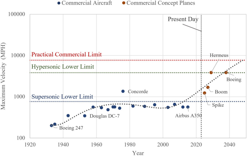 It is possible to review historic trends of the FOMs by plotting the FOM value of a given system over time. In the figure below, we plot the maximum velocity of various existent commercial aircraft and projected commercial aircraft concepts.