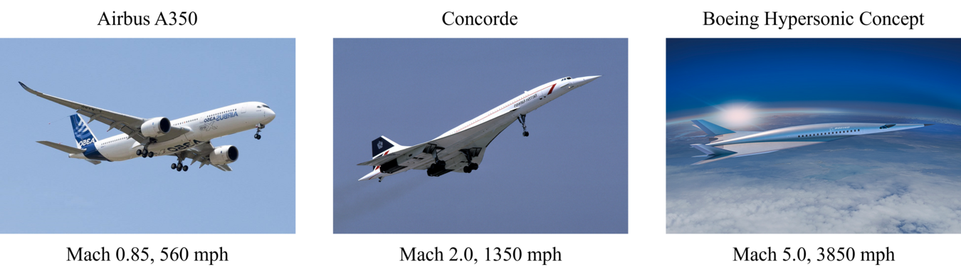 It is important to note that achieving higher speed flight is driven by underlying technology advances and differences in aircraft design. These differences are visible in the image below, which shows example transonic, supersonic, and hypersonic aircraft. Clearly, the higher speed vehicles are becoming more slender, and the degree of coupling of the subcomponents (i.e. the wings, fuselage, and propulsion devices) is becoming much higher.