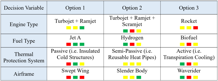 There are a myriad of architectural decisions that must be considered when designing a hypersonic transport system, of which it is impossible to list them all. In the below architectural matrix, we list four of the most important decision areas. For each area, we list three possible solution options. These options are loosely quantified according to the relative performance impact (i.e. velocity and aircraft range), cost, and effect on system safety. For example, a color code of green-red-yellow indicates relatively high performance impact, high cost, and average or undetermined impact on system safety.