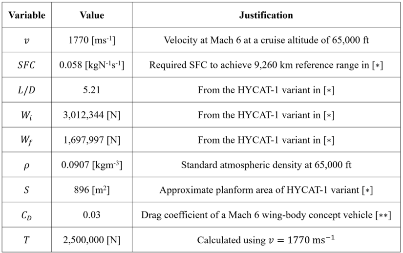 | Aircraft Speed | [m/s] | Maximum velocity of the aircraft during the flight. Correlates to cruise velocity for hypersonic commercial transport vehicles. |