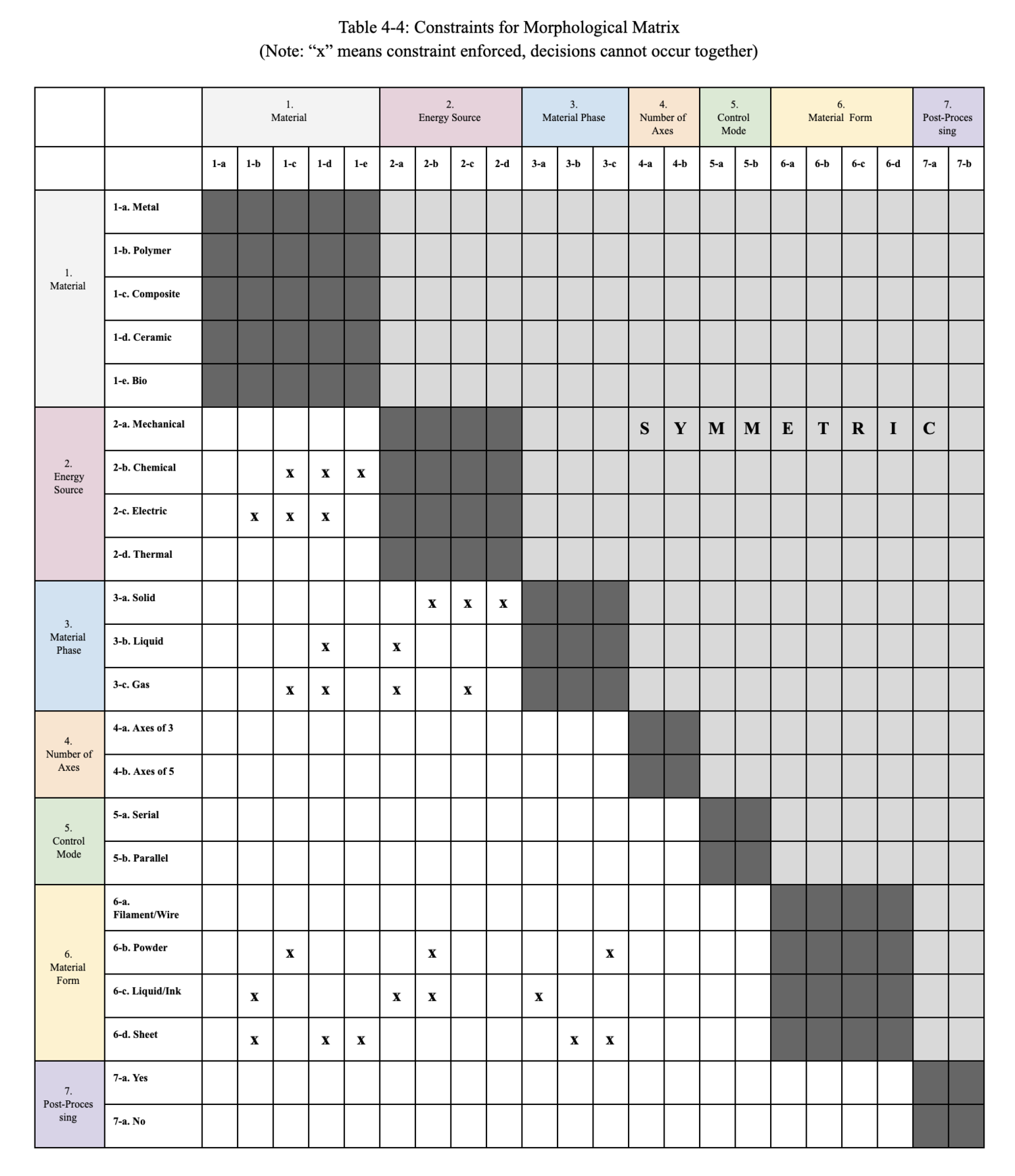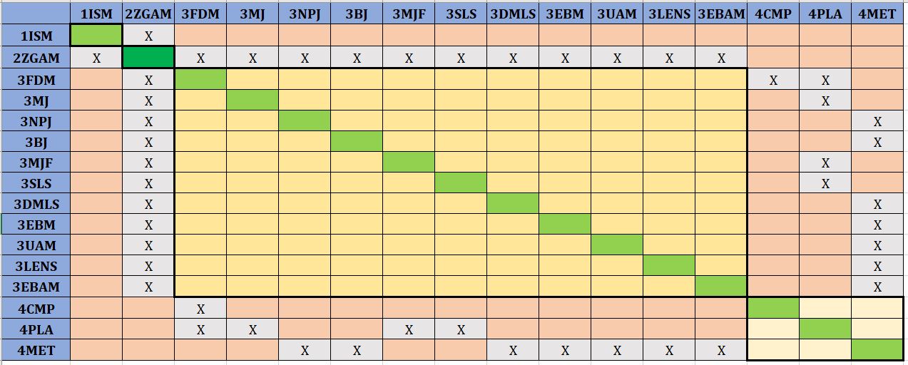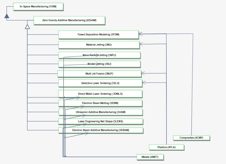 The Zero Gravity Additive Manufacturing (2ZGAM) roadmap is housed under the umbrella of an In-Space Manufacturing (1ISM) roadmap, which includes additional types of ISM, such as In-Space Surface Manufacturing where in-situ resources are used to fabricate components in a partial-gravity, planetary surface environment. The 2ZGAM roadmap requires the following key enabling technologies at the process level: 3FDM Fused Deposition Modeling, 3MJ Material Jetting, 3NPJ NanoParticle Jetting, 3BJ Binder Jetting, 3MJF Multi Jet Fusion, 3SLS Selective Laser Sintering, 3DMLS Direct Metal Laser Sintering, 3EBM Electron Beam Melting, 3UAM Ultrasonic Additive Manufacturing, 3LENS Laser Engineering Net Shape, and 3EBAM Electron Beam Additive Manufacturing. Due to the absence of a preferred acceleration vector orientation in microgravity, additive manufacturing techniques that rely upon a well-defined liquid-gas interface at the surface of a vat of resin, such as stereolithography & digital light processing (i.e. vat polymerization), cannot be used and are thus not captured in this first-level DSM. The enabling manufacturing process technologies for the 2ZGAM roadmap in turn require enabling technologies at level 4, which is the material component level: 4CMP Composites, 4PLA Plastics, and 4MET Metals.