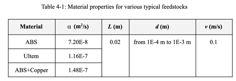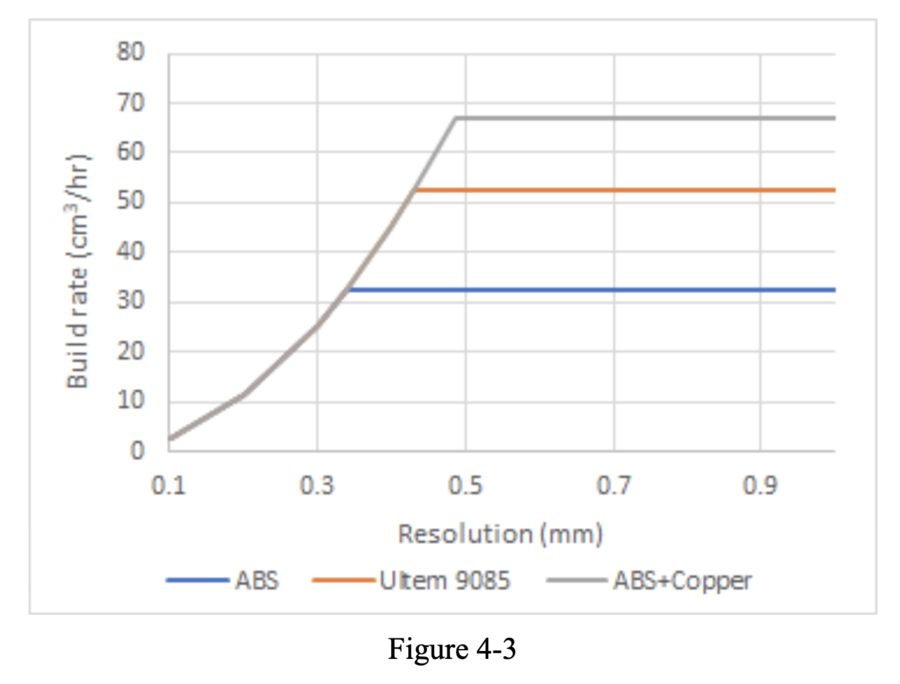 We can now plot the build rate vs. resolution for the parameter values shown in the table above. We see that the particular feedstock material affects the critical nozzle exit diameter (i.e. resolution) at which the active constraint on build rate switches from the traverse speed of the print head to be now limited by the heat transfer from the nozzle. The thermal diffusivity, , of the feedstock material also affects the maximum build rate achievable. However, when traverse speed is the limiting factor, the build rate is independent of material and only depends instead on the desired resolution.