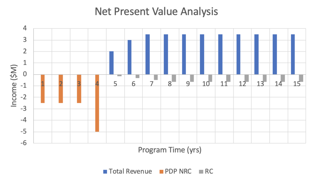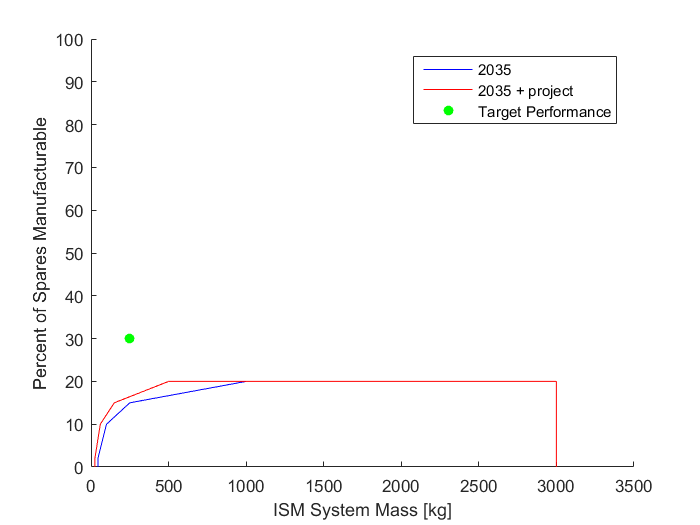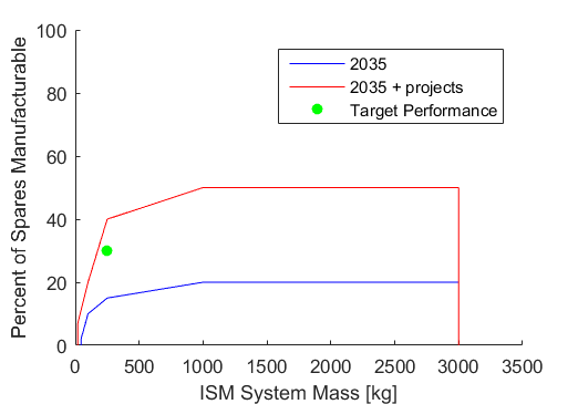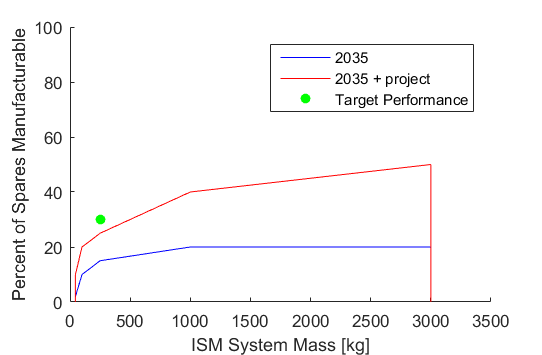 Because the overall size, weight, and power of our ISM system will be severely constrained, as is common in space systems engineering, a potential development project involves achieving improvements in the ratio of build volume to overall system volume. Terrestrial additive manufacturing equipment is not nearly as volume constrained as an in-space manufacturing unit would be. Thus, a concerted development effort would be necessary to achieve improvements in this packaging efficiency of the build volume within the unit. This could take the form of miniaturization of the ancillary manufacturing support equipment, or of re-design of the build tray and gantry system to more efficiently utilize available volume. A development project to simply reduce the mass of existing ISM capability is not enough to reach the desired target, as shown below.