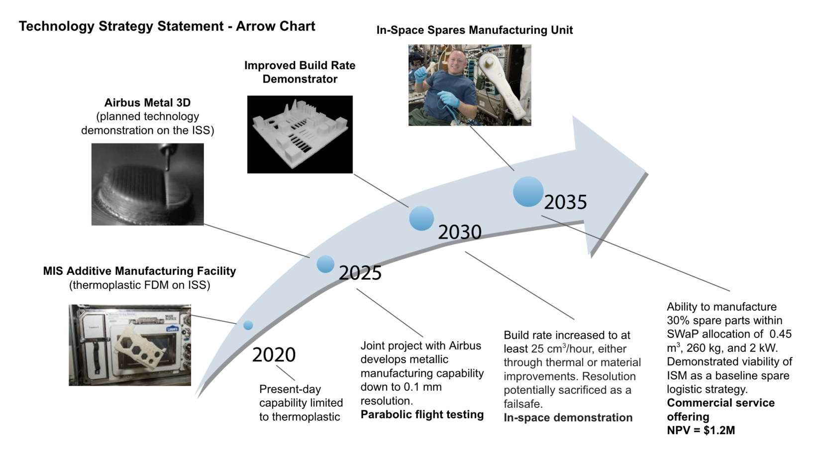 The utopia point for the chart above is on the bottom right corner and at-present the Pareto front for Terrestrial SOA is closer to the utopia point than for ISM SOA. The parts which we will be manufacturing in space need to be of high quality and should have a reasonable manufacturing time. If the parts produced in space have a much lower resolution (higher micrometers) and have a low build rate (and consequently high build times and mean times to failure), then the manufactured parts may be unusable and provide minimal advantage over manufacturing on earth. The focus here is to shift the Pareto front for ISM SOA closer to the utopia point which can be achieved by maximizing resolution (lower micrometers) and build rate within reasonable limits. Working on improvements in both areas align with our strategic drivers and will help us achieve our goals within the target dates specified in the Technology Strategy Statement mentioned in the latter section.