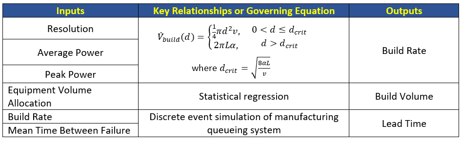 For this problem, we will focus on two figures of merit: (1) the ratio of build volume to overall manufacturing equipment volume, and (2) build rate [cm^3/hr]. Whereas the volume ratio will be determined using statistical regression techniques from available data about existing manufacturing equipment, the build rate will be computed from the fundamental physics of the manufacturing process (although it can also be validated with experimental results).