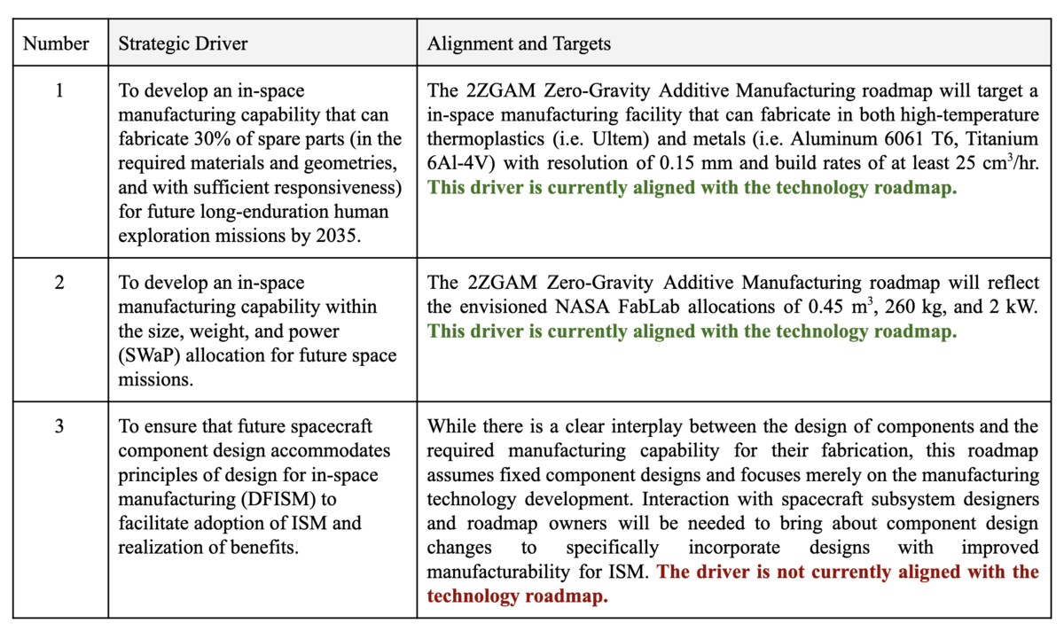 The table below shows an example of strategic drivers and their alignment with the Zero-Gravity Additive Manufacturing (2ZGAM) roadmap.