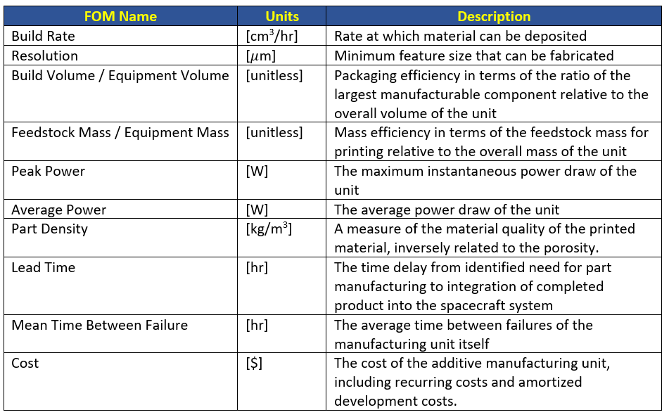 The table below shows a list of FOMs by which in-space additive manufacturing can be assessed. Most of the FOMs are related to the performance of the printer such as build rate, resolution, build volume, lead time and mean time to failure. Feedstock mass, as well as cost, relates to the manufacturing efficiency when creating the printer itself. Finally, peak power, average power, and density relate to the energy consumption and efficiency of printing.