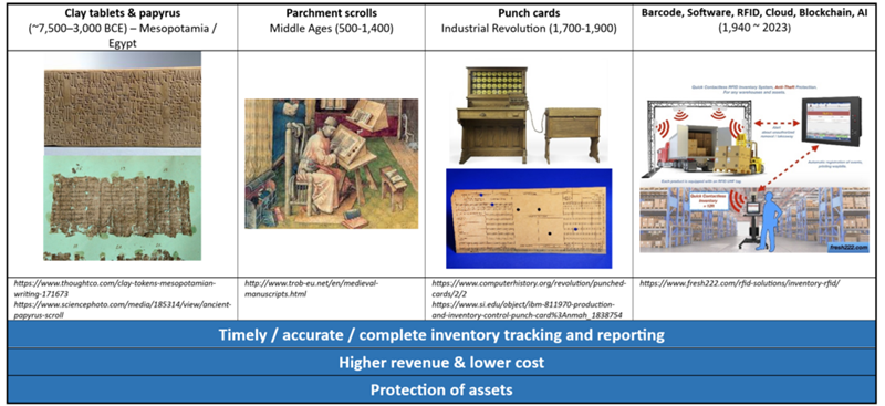 IMS can be traced back to ancient civilizations (e.g., Mesopotamia and Egypt), where traders and merchants used rudimentary ledger systems to keep track of their animals and products. Clay tablets and papyrus scrolls were used to record information about inventory levels, transactions, and trade. Over time, IMS developed into more accurate and complex systems for record keeping with the development of more rigorous accounting method, mass production of goods during Industrial Revolution and development of computers and software applications.