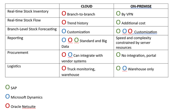 Selecting the top 3 ERPs with Inventory Management Systems, we compared critical functionalities that customers need today from these IMS which not involve not just stock monitoring but stock flow management and forecasting. These functionalities are very dependent on connectivity, which we highlighted as a critical technological constraint above.
