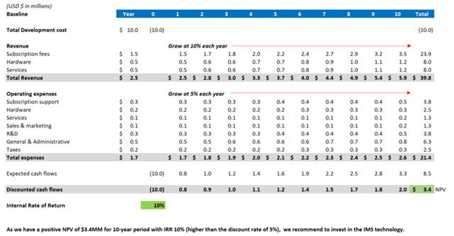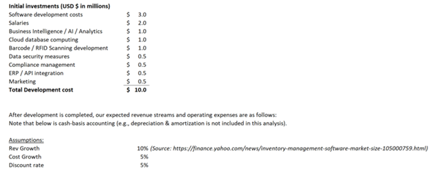 For developing a new "Inventory Management System (IMS)", the development cost of $10MM will be spent in the first year to the following areas. Please note that the $ amounts herein are NPV demonstrative purpose only as there is a wide range of IMS's with limited public information available.