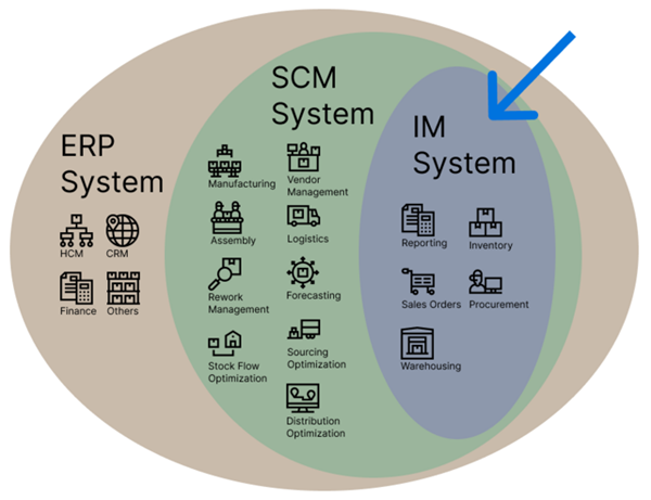 Positive and negative scope of an IM System as of publication of this roadmap. Figure shows that in Enterprise Resource Planning (ERP) and Supply Chain Management (SCM) systems, some modules can overlap with an IM System, however, wherein IM systems are purchased standalone, below are what is currently considered core IM modules.