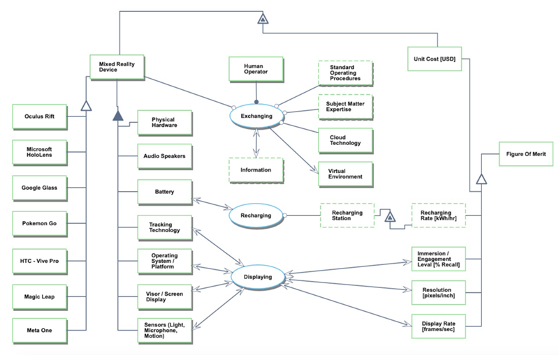 We provide an Object-Process-Diagram (OPD) of the augmented, virtual, and mixed reality roadmap in Figure 3 below. This diagram captures the main object of the roadmap, mixed reality device, its various instances including main competitors, its decomposition into subsystems (hardware, battery, operating system, etc), its characterization by Figures of Merit (FOMs) as well as the main processes (Exchanging, Recharging, and Displaying).