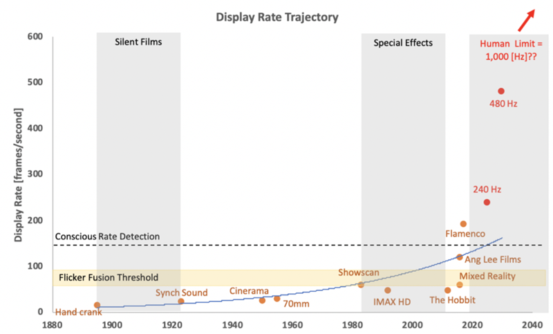 The human visual system can typically perceive images individually at a rate up to 10-12 images per second; anything beyond that is perceived as motion to the human eye. This is the starting point for humans to perceive motion pictures, and it began in earnest in 1891 with the invention of the kinetoscope, the predecessor to the modern picture projector. Although the primary comparison for this FOM resides in the film industry, it is not the only use. The gaming industry, theme parks, and now mixed reality technology all have a stake in optimizing this FOM for performance.