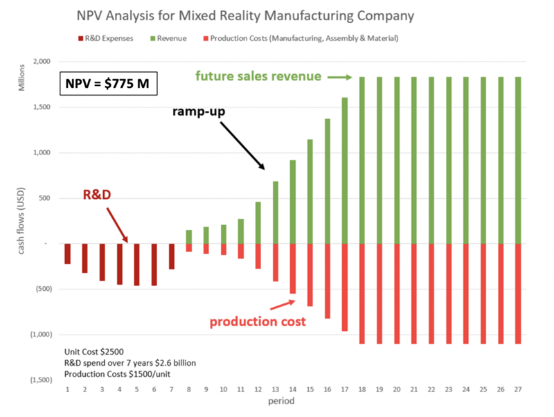The figure below contains an NPV analysis underlying the Mixed Reality roadmap. It shows the production cost of device development, which includes the R&D expenditures as negative numbers. A ramp up-period of 5-7 years is planned with a flat revenue plateau and a total program duration of 27 years.