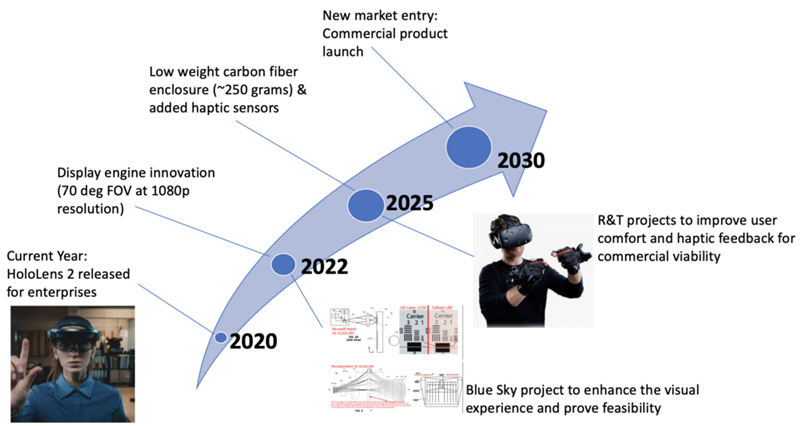 Our target is to develop a mixed reality device with an entry into the consumer market of 2030 with a target of a head mounted device of less than 250 g, field of view of 70 degree at high resolutions, and a haptic sensor. To achieve the targets we will invest in R&D projects that (1) improves field of view and angular resolution to enhance the immersive experience of holograms, (2) reduces the overall weight of the device to enable a more comfortable user experience, and (3) increases the amount of sensor interaction capabilities. We will first launch a Blue Sky research project to advance the Mixed Reality display engine and prove basic feasibility by 2022. Once the ability to provide a 70 degree FOV at high resolution is achieved, the project will move through the phases of R&D to reach our ultimate success of commercial success by 2030. These are enabling technologies to reach our 2030 technical and business targets.