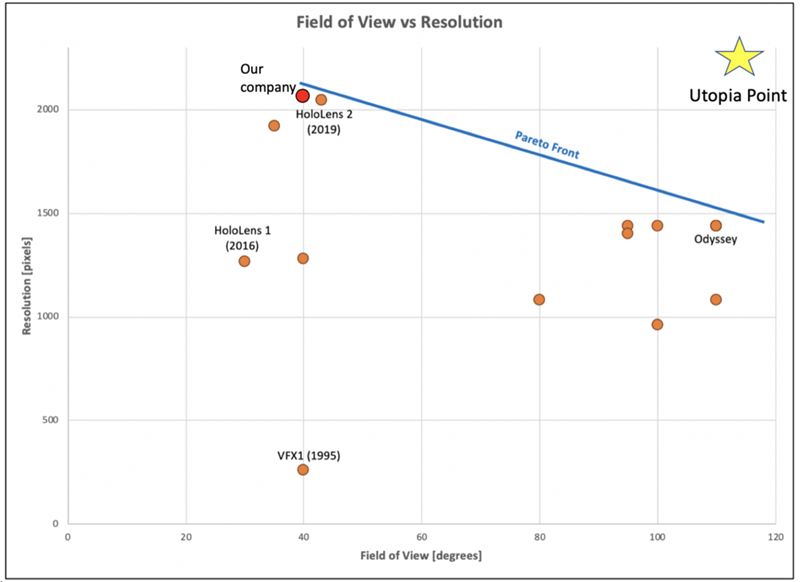 As Figure 10 illustrates, Microsoft are currently pushing the Pareto Front boundaries in terms of resolution and FOV. The 1995 VFX1 product is also included in this FOM chart to illustrate where the Pareto Frontier existed 25 years ago. The leap from HoloLens Gen 1 to HoloLens Gen 2 is quite impressive and clearly separates HoloLens as the top provider of display resolution.