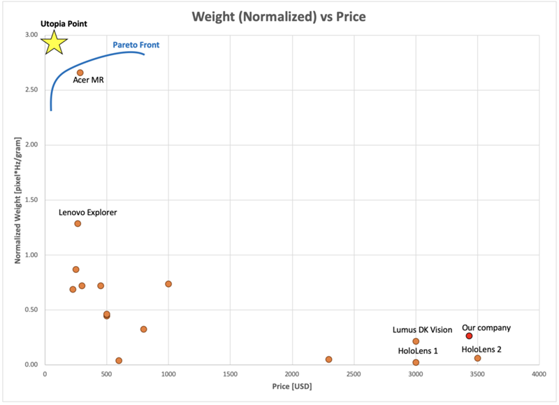 Note: In this case, the direct weight vs price graph did not yield a clear Pareto Front and was therefore not as useful for the technology roadmap. Instead, the weight was normalized by key performance FOMs to derive a more clear Pareto Front for our company to consider. Specifically, the weight was normalized by display resolution and frame rate - (resolution*frame rate)/weight. This normalized FOM provides a more clear Pareto Front in Figure 11 and demonstrates which Mixed Reality products on the market achieve high display performance relative to the unit weight.