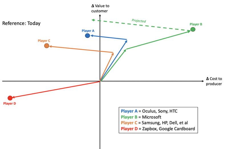 A summary of the overall AR, VR, and MR competitive positioning is depicted below in the Vector Chart. Player A represents the early VR players who got control of the market early and have not had to make salient strategic moves given the lack of competition in the early days of the marketplace. Player B is meant to represent Microsoft specifically and align with their recent strategies. Player C comprise the Low Cost Providers who have recently cropped up in an attempt to claim market share. Player C (like Player A) began as a fast follower but quickly shifted to focus on a low cost option. Finally, Player D presents the extremity of a Low Cost Provider. These companies truly sacrificed FOMs for the sake of low cost. Although their hardware is made largely from cardboard and their products lack the overall utility of other players, they have been able to provide the semblance of a virtual experience for as low as $30/unit.