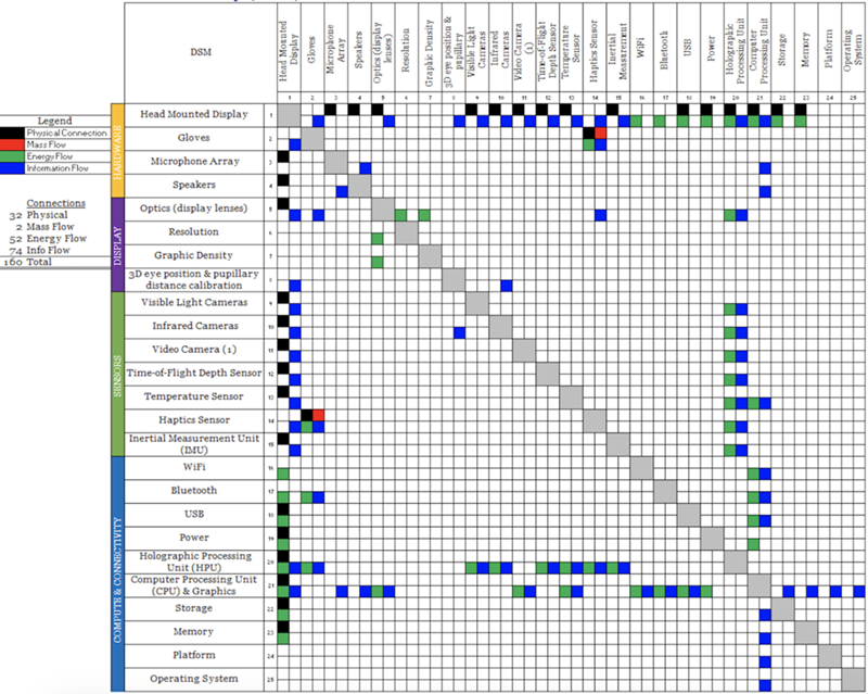 The DSM above shows us that mixed reality technology requires the following key enabling technologies at the subsystem level: Holographic Processing Units (HPU), Computer Processing Units (CPU) / advanced computing capabilities, sensors (e.g. this includes various optic sensors, haptic sensors, etc), and connectivity (e.g. WiFi, Bluetooth, etc).