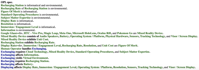 An Object-Process-Language (OPL) description of the roadmap scope is auto-generated and given below. It reflects the same content as the previous figure, but in a formal natural language.