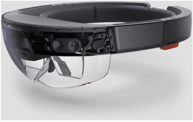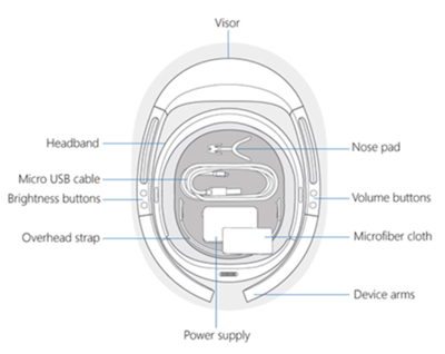 Mixed reality, on the other hand, incorporates both of these ideas to create a hybrid experience where the user can interact with both the real and virtual world. Mixed reality devices can take many forms. For the purposes of this technology roadmap we've elected to narrow our focus to wearable headgear (heads up) devices. These devices are typically fashioned with visual displays and tracking technology that allow six degrees of freedom (forward/backward, up/down, left/right, pitch, yaw, roll) and immersive experiences. The elements of form for an example mixed reality product, the Microsoft HoloLens (1st generation), are depicted in the figures below.