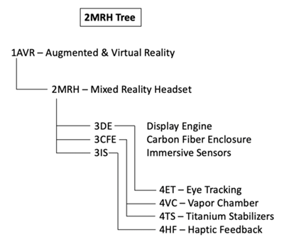 The 2-MRH tree that we can extract from the DSM below shows us that the Mixed Reality Headset (2MRH) is part of a larger company-wide initiative on Augmented and Virtual Reality (1AVR), and that it requires the following key enabling technologies at the subsystem level: 3ED Display Engine, 3CFE Carbon Fiber Enclosure, and 3IS Immersive Sensors. In turn, these require enabling technologies at level 4, the technology component level: 4VC vapor chamber components in the back of the processing units, 4ET eye tracking technology improvements, 4TS titanium stabilizers and spacers that make the headset more comfortable and stable and 4HF haptic feedback sensors (e.g., gloves or control panels that exchange tactile information).