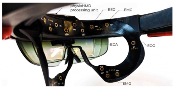 The particular device being used in this case, PhysioHMD, incorporates bio-potential input signals. The position of the device on the face of the user permits the collection of facial expressions as well as data from the neocortex and frontal cortex of the human brain. This data is gathered from the bio-facial sensors included as part of the PhysioHMD architecture. An example of the PhysioHMD sensors is shown in Figure 18.
