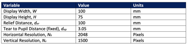 - Design variables: Display width, W [mm]; display height, H [mm]; relief distance, der [mm]; horizontal and vertical resolution, Nh & Nv [pixels])
