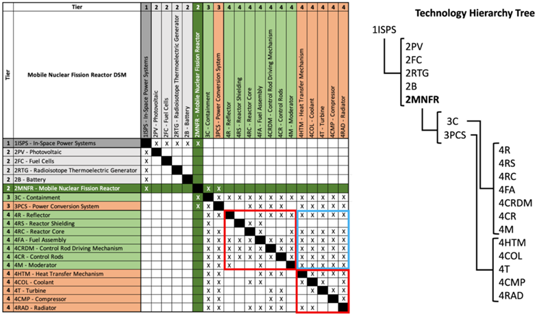 The Mobile Nuclear Fission Reactor is identified to be a tier two technology because it is part of a wider initiative to develop power technologies (such as fuel cells, photovoltaics etc.) that can support in-space power systems for human habitats on other planetary surfaces. The Mobile Nuclear Fission Reactor (2-MNFR) is highlighted in dark green in the DSM below on the left. The MNFR is then broken down into two tier three systems which includes the containment and power conversion system. The containment and power conversion systems are then further broken down into tier four subsystems as summarized in the technology hierarchy tree below on the right.