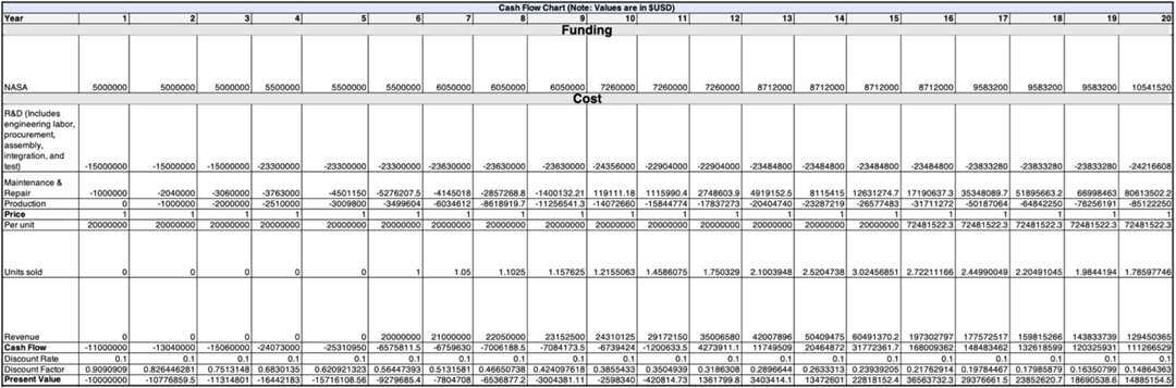 Our financial model involves two major components: A cash flow chart and net present value (NPV) calculation over a 20 year project duration (assumed period). Due to a lack of historical data for the cost of space reactors (especially since the US has had only one flight test since the 1950s), our team hinges upon engineering estimates and parametric modeling to make predictions on the company’s cash flow and net present value.