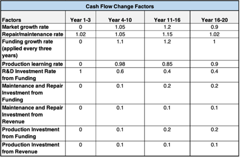 To understand how the cash flow table was constructed, we provide a table of “Cash flow change factors” between each of the twenty years to help understand how the numbers on the cash flow chart change over the course of 20 years.