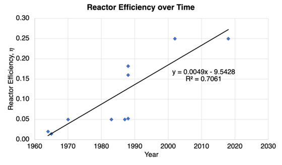 One might argue that there is a complete S-curve relationship (i.e. the technology has reached “stagnation”) between the reactor efficiency over time as shown in Figure 2.