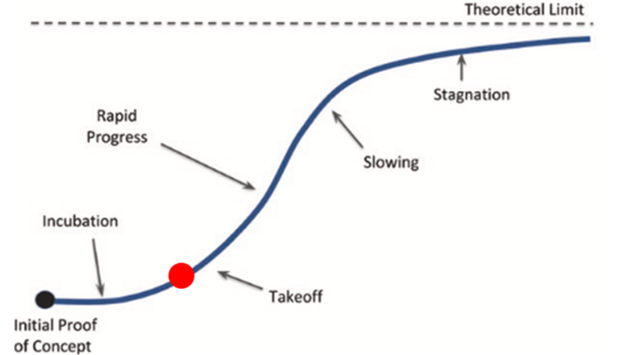 Between 1964 to 2018, which spans over 5 decades, fewer than 15 mobile nuclear reactors for space power systems were developed. Of the 11 reactor systems that data was collected for in this problem for this assignment, some systems were experimental and ground tested while some were launched and operational (hence the mobile nuclear reactor technology is past the “Initial Proof of Concept” phase). The lack of funding/interest that cut many programs short (such as SAFE-400 and Topaz 2) and prevented them from progressing to flight tests, paired with data points that are too sparse to consistently show “rapid progress” indicates that the technology likely did not make it past the “take off” stage.