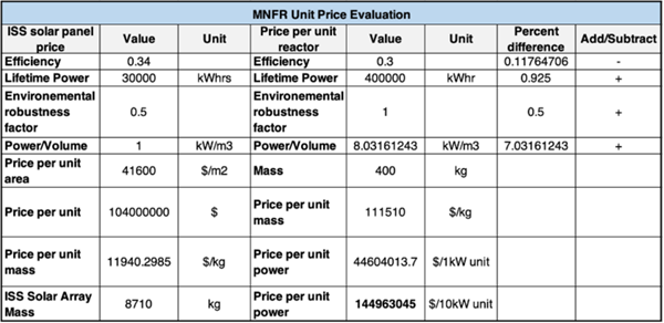 Note: In the table above, we use the price of the ISS solar array as a baseline for price estimation of the mobile nuclear fission reactor at year 16 and onwards. Using the percentage differences between the performance of the solar array [from sources [18-31]) versus the KRUSTY reactor [23], the reactor cost was increased or decreased proportionally based on whether the reactor performance was an improvement or not from the solar array, respectively.