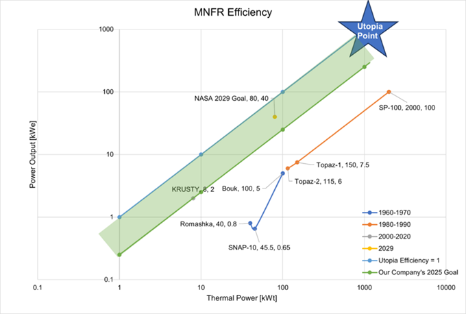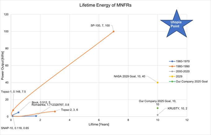 The UTOPIA point of lifetime energy is to have the highest power output for the longest duration. That of reactor efficiency, is a value of one, since this would mean 100% of the thermal energy released during the fission process is converted into electrical energy. Since the intention of current development of mobile nuclear fission reactors is to provide sufficient power for a crewed long duration space mission, the pareto front of lifetime energy as well as reactor efficiency is set by KRUSTY (Chapter 5, Figure 5-20). KRUSTY has the highest operational lifetime compared to previously developed MNFRs. Though the previously developed SP-100 has a high power output with an operational lifetime of 7 years, it was intended for short term military purposes, and as seen in the efficiency evaluation, is less efficient than KRUSTY. The earlier designs in the 1960s were also generally intended for military purposes, and though intended for longer operational lifetimes, when tested ran into various technical issues that ended up with system failure early on. NASA's goal is to be able to develop a reactor that would generate 40 kWe consistently for 10 years by 2029. These values are based on requirements developed for a hypothetical crewed Martian habitat that would need to be sustained for a 10 year mission. That being said, our company's goal is to meet our targets based on our strategic drivers by 2025, as seen in the plot. For lifetime energy that it to develop a generator that produces 10 kWe consistently for 10 years, with an efficiency greater than 25%.