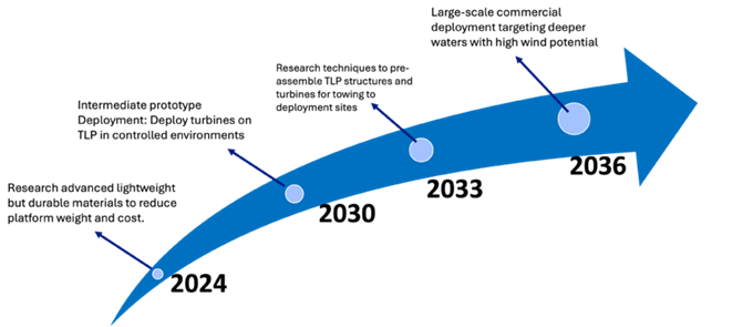 Our ultimate target is to provide mobile nuclear fission reactor units that can be part of a power grid to support continuous human presence on the Moon and eventually on Mars. To do so, we target to be able to demonstrate 40kW system that can last 10 years on the lunar surface using High Assay Low Enriched Uranium (HALEU) by 2025, which aligns with the goals of the NASA Fission Surface Power program that falls under the Artemis program umbrella. By 2028, which is ~5 years from the present day, we target to have flight-ready hardware that is ready for integrated testing with launch vehicles and lead to our first flight test. By ~2030, we aim to demonstrate our nuclear fission reactor system on the Lunar surface, which will lead to a power grid system design on the lunar surface. Our goal is to also provide scalable mobile nuclear fission reactors (by power output) to accommodate future mission requirements and power grid designs. By 2040 and beyond, our target is to have operational surface fission reactors that support continuous presence on the Moon and Mars. These targets are summarized and captured in the "Swoosh Chart" shown below.