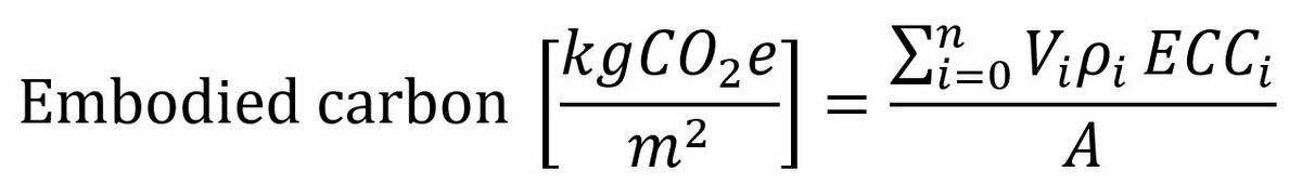The embodied energy of the materials used in the building. For comparison of the metric, we normalize it by the area of the building and measure it in kgCO2e/m2: